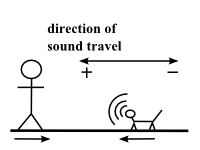 In this formula, the key to success is following the sign conventions. The direction that the sound travels is always the positive direction; set the other velocities accordingly. For example, consider a problem in which a person and a barking dog run toward each other as shown at the right. The sound travels to the left, so everything moving left must have positive velocity, and vice versa. Therefore v is positive (as always); vo is negative since the human obersever is moving right, and vs is positive because the dog (the sound source) is running left.- It’s always a good idea to make sure your answers make sense. Remember that when the source and observer are getting closer together, you expect the frequency to increase, i.e., fo > fs . Conversely, when the source recedes from the observer, expect a decreasing frequency, or fo < fs.
